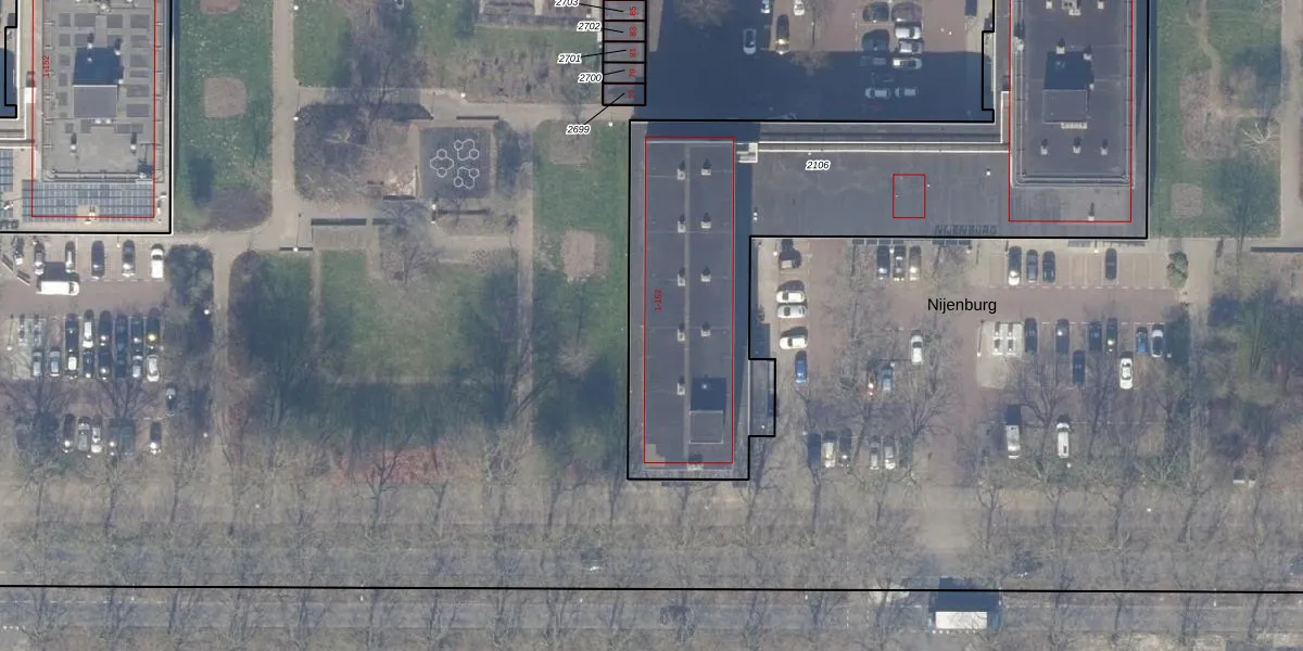 Het perceel waarop Nijenburg 25 staat heeft een oppervlakte van 2815 m². Dit is een zeer groot perceel. De perceeloppervlakte wordt geregistreerd door het Kadaster. Gedetailleerde informatie over de maten van dit perceel kunt u vinden in het rapport Kadastrale kaart met maatvoering van Nijenburg 25.