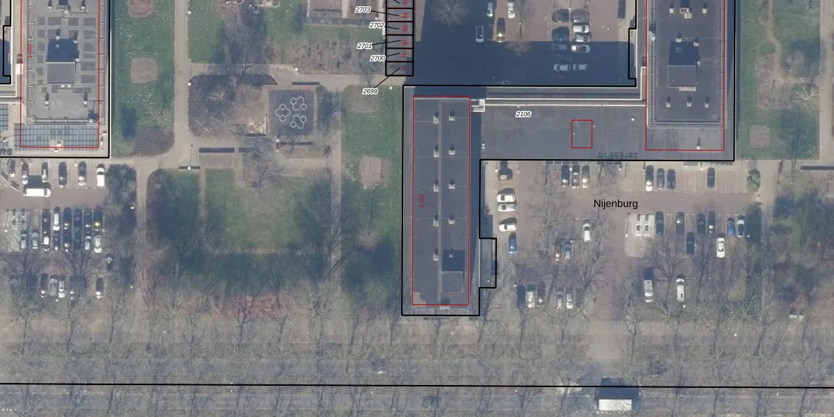 Het perceel waarop Nijenburg 29 staat heeft een oppervlakte van 2815 m². Dit is een zeer groot perceel. De perceeloppervlakte wordt geregistreerd door het Kadaster. Gedetailleerde informatie over de maten van dit perceel kunt u vinden in het rapport Kadastrale kaart met maatvoering van Nijenburg 29.