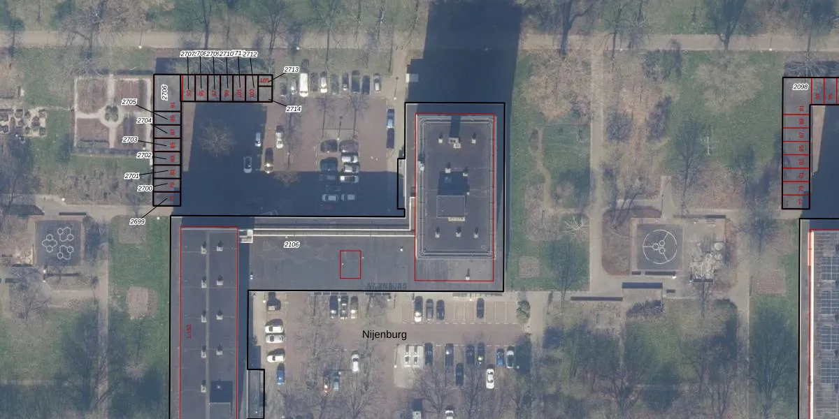 Het perceel waarop Nijenburg 38 staat heeft een oppervlakte van 2815 m². Dit is een zeer groot perceel. De perceeloppervlakte wordt geregistreerd door het Kadaster. Gedetailleerde informatie over de maten van dit perceel kunt u vinden in het rapport Kadastrale kaart met maatvoering van Nijenburg 38.