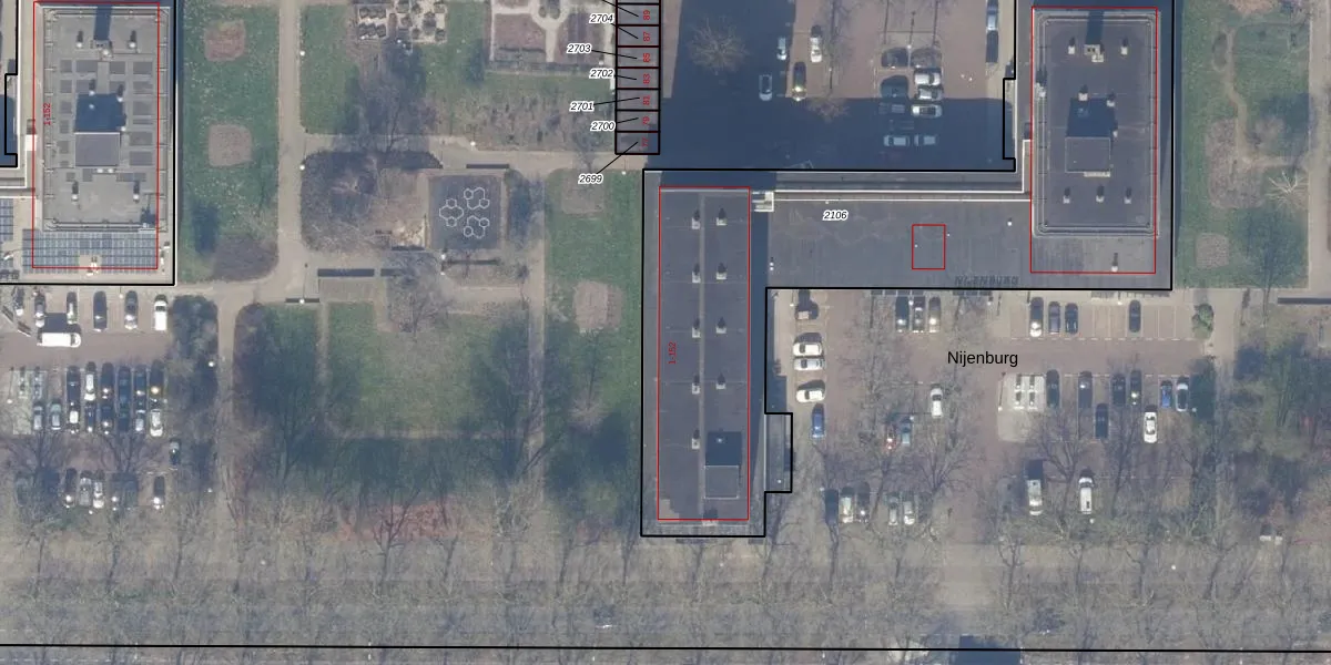 Het perceel waarop Nijenburg 41 staat heeft een oppervlakte van 2815 m². Dit is een zeer groot perceel. De perceeloppervlakte wordt geregistreerd door het Kadaster. Gedetailleerde informatie over de maten van dit perceel kunt u vinden in het rapport Kadastrale kaart met maatvoering van Nijenburg 41.