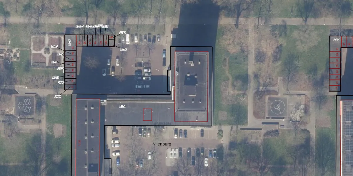Het perceel waarop Nijenburg 56 staat heeft een oppervlakte van 2815 m². Dit is een zeer groot perceel. De perceeloppervlakte wordt geregistreerd door het Kadaster. Gedetailleerde informatie over de maten van dit perceel kunt u vinden in het rapport Kadastrale kaart met maatvoering van Nijenburg 56.