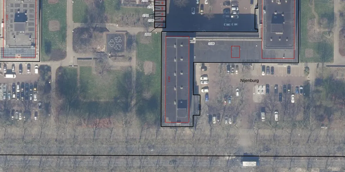 Het perceel waarop Nijenburg 73 staat heeft een oppervlakte van 2815 m². Dit is een zeer groot perceel. De perceeloppervlakte wordt geregistreerd door het Kadaster. Gedetailleerde informatie over de maten van dit perceel kunt u vinden in het rapport Kadastrale kaart met maatvoering van Nijenburg 73.