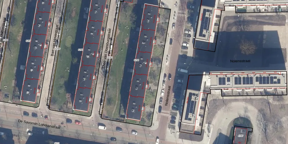Het perceel waarop Nolensstraat 13-2 staat heeft een oppervlakte van 3066 m². Dit is een zeer groot perceel. De perceeloppervlakte wordt geregistreerd door het Kadaster. Gedetailleerde informatie over de maten van dit perceel kunt u vinden in het rapport Kadastrale kaart met maatvoering van Nolensstraat 13-2.