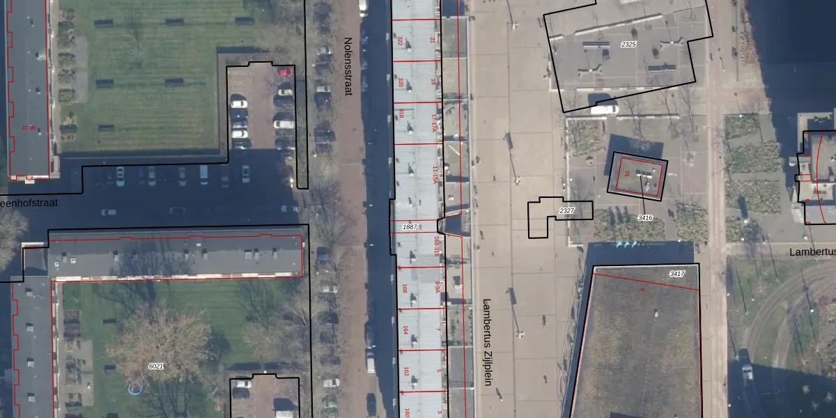 Het perceel waarop Nolensstraat 300 staat heeft een oppervlakte van 2005 m². Dit is een zeer groot perceel. De perceeloppervlakte wordt geregistreerd door het Kadaster. Gedetailleerde informatie over de maten van dit perceel kunt u vinden in het rapport Kadastrale kaart met maatvoering van Nolensstraat 300.