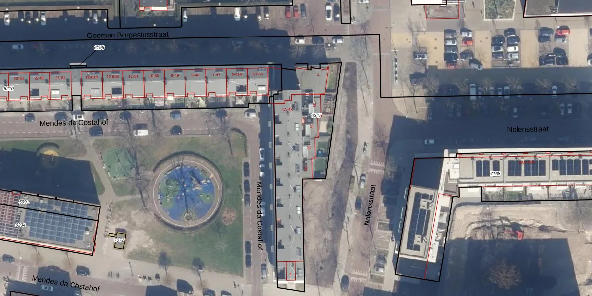 Het perceel waarop Nolensstraat 35 staat heeft een oppervlakte van 1086 m². Dit is een zeer groot perceel. De perceeloppervlakte wordt geregistreerd door het Kadaster. Gedetailleerde informatie over de maten van dit perceel kunt u vinden in het rapport Kadastrale kaart met maatvoering van Nolensstraat 35.