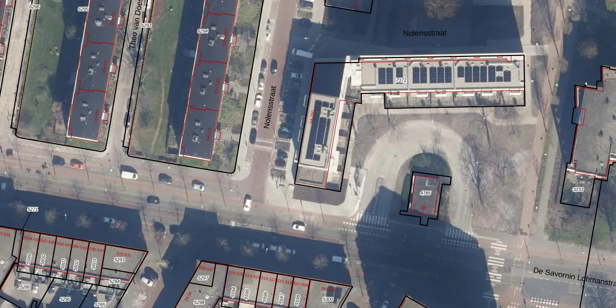 Het perceel waarop Nolensstraat 6-B staat heeft een oppervlakte van 1465 m². Dit is een zeer groot perceel. De perceeloppervlakte wordt geregistreerd door het Kadaster. Gedetailleerde informatie over de maten van dit perceel kunt u vinden in het rapport Kadastrale kaart met maatvoering van Nolensstraat 6-B.