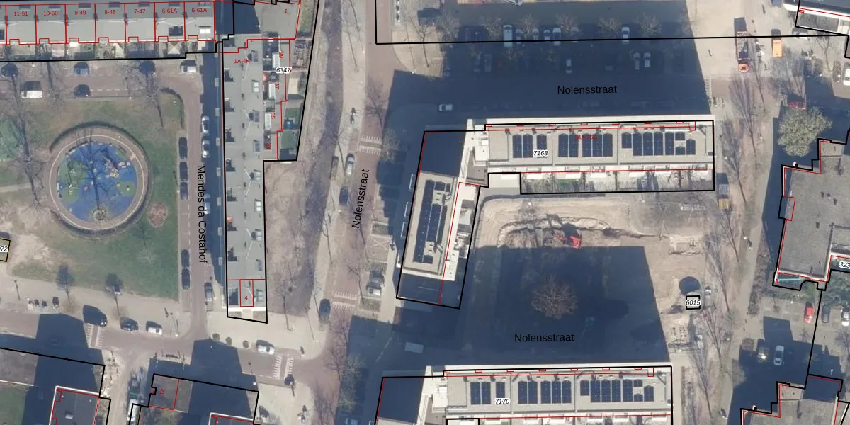 Het perceel waarop Nolensstraat 66-B staat heeft een oppervlakte van 1465 m². Dit is een zeer groot perceel. De perceeloppervlakte wordt geregistreerd door het Kadaster. Gedetailleerde informatie over de maten van dit perceel kunt u vinden in het rapport Kadastrale kaart met maatvoering van Nolensstraat 66-B.