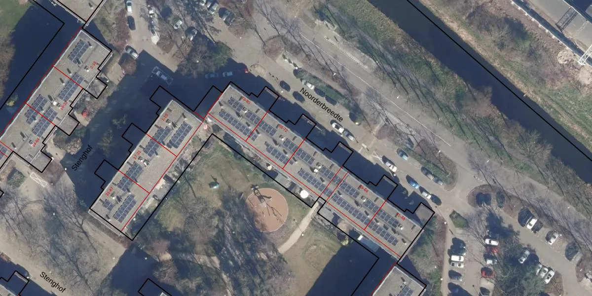 Het perceel waarop Noorderbreedte 66 staat heeft een oppervlakte van 6325 m². Dit is een zeer groot perceel. De perceeloppervlakte wordt geregistreerd door het Kadaster. Gedetailleerde informatie over de maten van dit perceel kunt u vinden in het rapport Kadastrale kaart met maatvoering van Noorderbreedte 66.