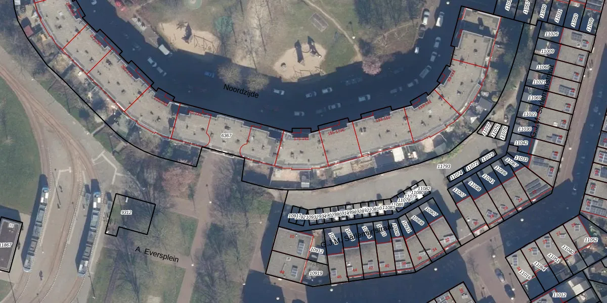 Het perceel waarop Noordzijde 189 staat heeft een oppervlakte van 4400 m². Dit is een zeer groot perceel. De perceeloppervlakte wordt geregistreerd door het Kadaster. Gedetailleerde informatie over de maten van dit perceel kunt u vinden in het rapport Kadastrale kaart met maatvoering van Noordzijde 189.