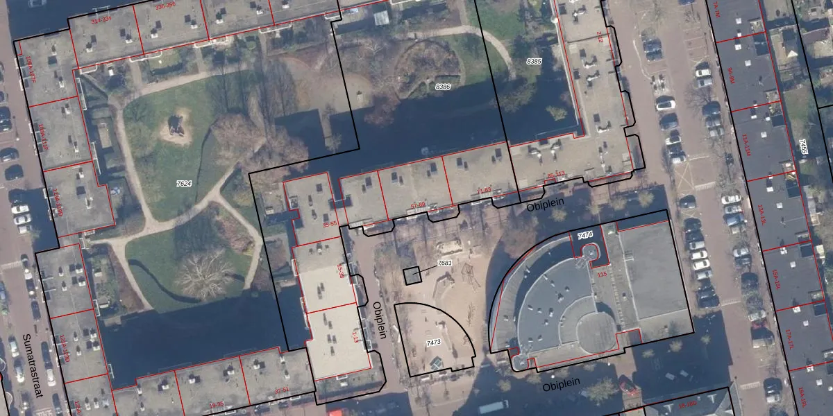 Het perceel waarop Obiplein 69 staat heeft een oppervlakte van 3439 m². Dit is een zeer groot perceel. De perceeloppervlakte wordt geregistreerd door het Kadaster. Gedetailleerde informatie over de maten van dit perceel kunt u vinden in het rapport Kadastrale kaart met maatvoering van Obiplein 69.