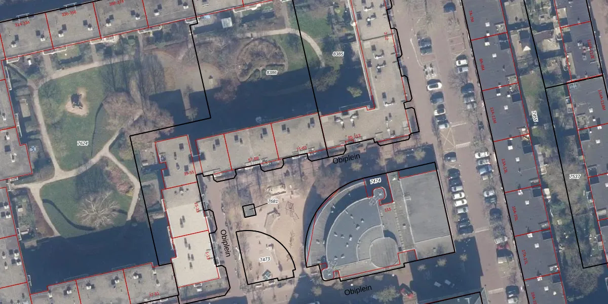 Het perceel waarop Obiplein 73 staat heeft een oppervlakte van 3439 m². Dit is een zeer groot perceel. De perceeloppervlakte wordt geregistreerd door het Kadaster. Gedetailleerde informatie over de maten van dit perceel kunt u vinden in het rapport Kadastrale kaart met maatvoering van Obiplein 73.