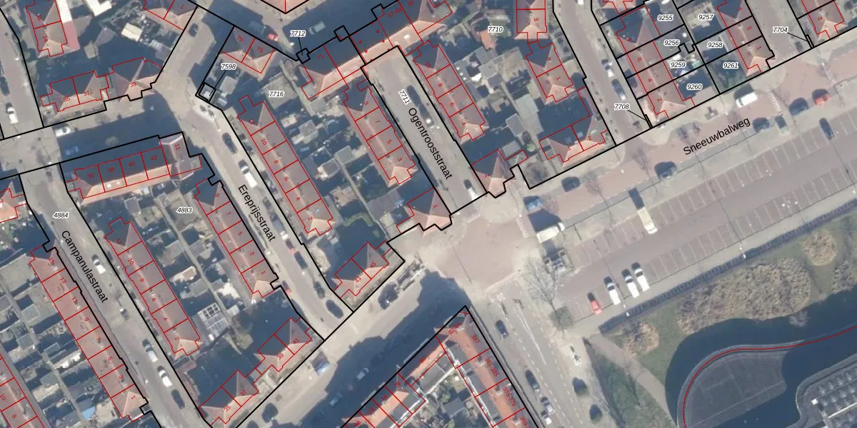 Het perceel waarop Ogentrooststraat 1 staat heeft een oppervlakte van 1938 m². Dit is een zeer groot perceel. De perceeloppervlakte wordt geregistreerd door het Kadaster. Gedetailleerde informatie over de maten van dit perceel kunt u vinden in het rapport Kadastrale kaart met maatvoering van Ogentrooststraat 1.