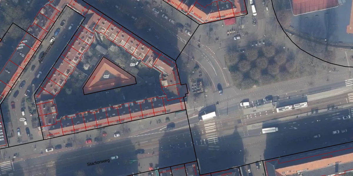 Het perceel waarop het adres ligt is ASD24-AC-870. De afkorting 'ASD24' staat voor kadastrale gemeente Amsterdam. De oppervlakte van het perceel is 5551 m². Dat is groter dan gemiddeld in Amsterdam, waar de gemiddelde perceeloppervlakte op 1365,99 m² ligt. De grootste perceeloppervlakte in de kadastrale gemeente is 11,7 ha. De kleinste oppervlakte bedraagt 1 m². Op het perceel zijn 169 adressen aanwezig. De huidige grenzen van het perceel zijn digitaal in de Basisregistratie Kadaster (BRK) geregistreerd op 04-10-2006.