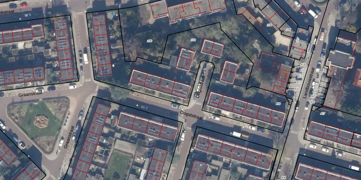 Het perceel waarop Oogststraat 104 staat heeft een oppervlakte van 3365 m². Dit is een zeer groot perceel. De perceeloppervlakte wordt geregistreerd door het Kadaster. Gedetailleerde informatie over de maten van dit perceel kunt u vinden in het rapport Kadastrale kaart met maatvoering van Oogststraat 104.