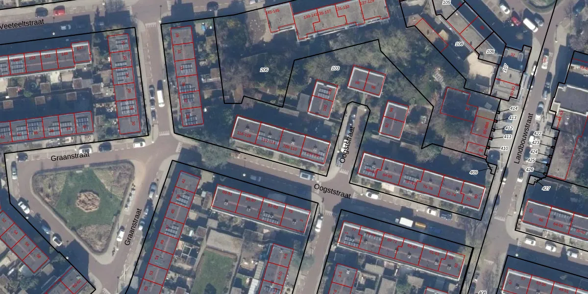 Het perceel waarop Oogststraat 110 staat heeft een oppervlakte van 3365 m². Dit is een zeer groot perceel. De perceeloppervlakte wordt geregistreerd door het Kadaster. Gedetailleerde informatie over de maten van dit perceel kunt u vinden in het rapport Kadastrale kaart met maatvoering van Oogststraat 110.