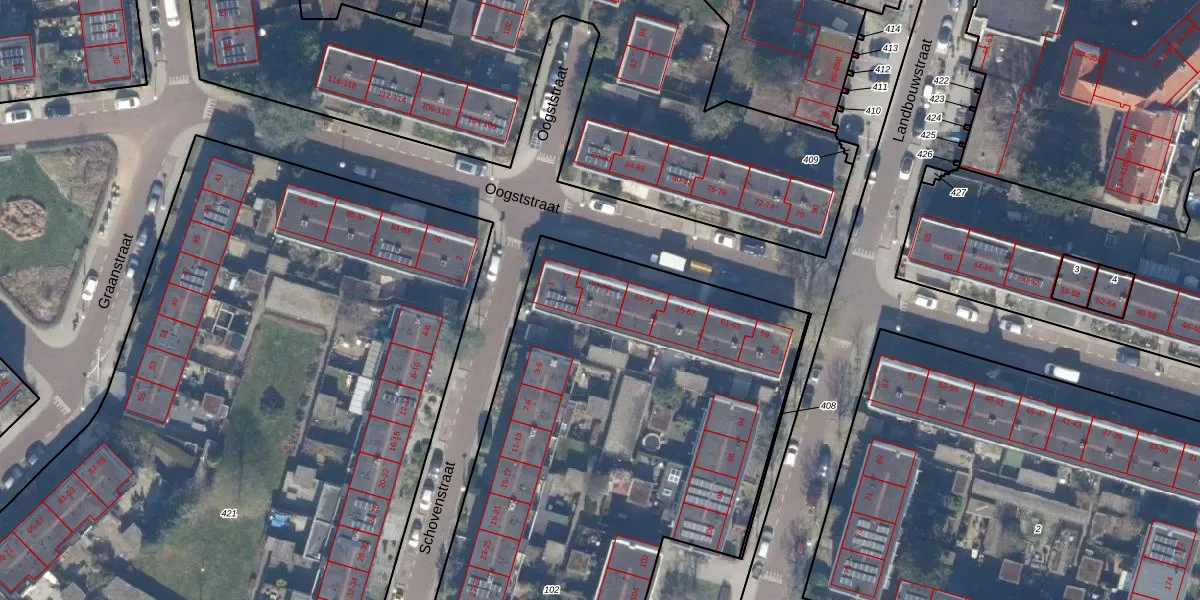 Het perceel waarop Oogststraat 73 staat heeft een oppervlakte van 4780 m². Dit is een zeer groot perceel. De perceeloppervlakte wordt geregistreerd door het Kadaster. Gedetailleerde informatie over de maten van dit perceel kunt u vinden in het rapport Kadastrale kaart met maatvoering van Oogststraat 73.