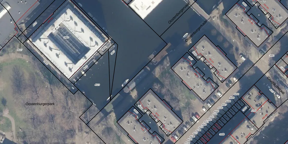 Het perceel waarop Oostenburgerkade 7 staat heeft een oppervlakte van 1,5 ha. Dit is een zeer groot perceel. De perceeloppervlakte wordt geregistreerd door het Kadaster. Gedetailleerde informatie over de maten van dit perceel kunt u vinden in het rapport Kadastrale kaart met maatvoering van Oostenburgerkade 7.