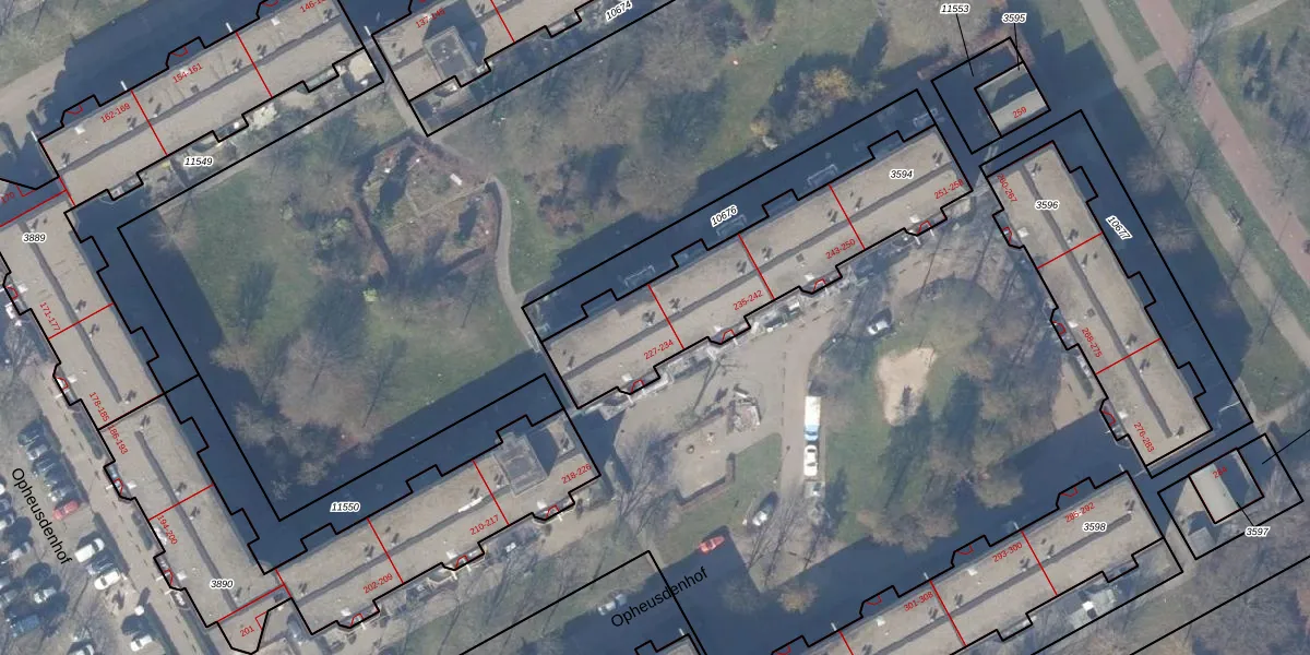 Het perceel waarop Opheusdenhof 233 staat heeft een oppervlakte van 884 m². Dit is een groot perceel. De perceeloppervlakte wordt geregistreerd door het Kadaster. Gedetailleerde informatie over de maten van dit perceel kunt u vinden in het rapport Kadastrale kaart met maatvoering van Opheusdenhof 233.