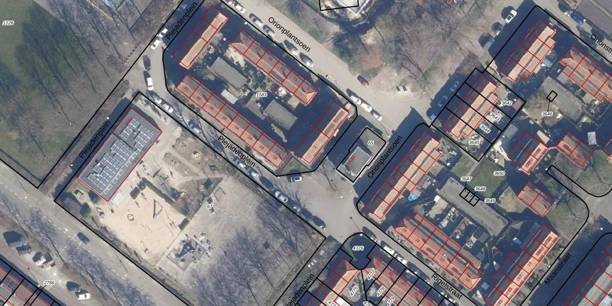 Het perceel waarop Orionplantsoen 1 staat heeft een oppervlakte van 2066 m². Dit is een zeer groot perceel. De perceeloppervlakte wordt geregistreerd door het Kadaster. Gedetailleerde informatie over de maten van dit perceel kunt u vinden in het rapport Kadastrale kaart met maatvoering van Orionplantsoen 1.