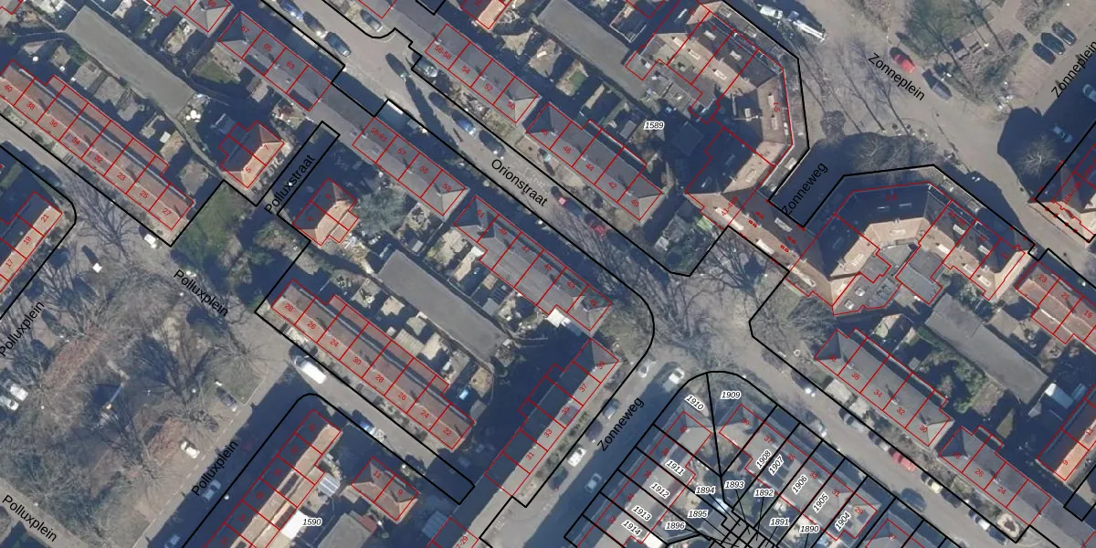 Het perceel waarop Orionstraat 45 staat heeft een oppervlakte van 1,4 ha. Dit is een zeer groot perceel. De perceeloppervlakte wordt geregistreerd door het Kadaster. Gedetailleerde informatie over de maten van dit perceel kunt u vinden in het rapport Kadastrale kaart met maatvoering van Orionstraat 45.