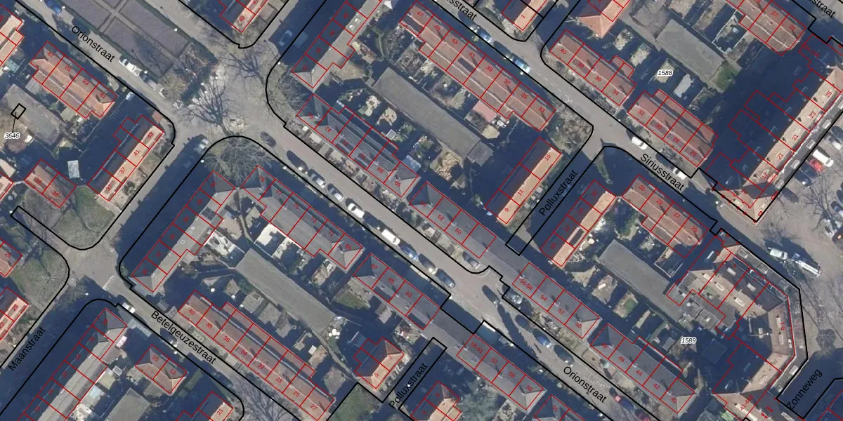 Het perceel waarop Orionstraat 64 staat heeft een oppervlakte van 1,2 ha. Dit is een zeer groot perceel. De perceeloppervlakte wordt geregistreerd door het Kadaster. Gedetailleerde informatie over de maten van dit perceel kunt u vinden in het rapport Kadastrale kaart met maatvoering van Orionstraat 64.