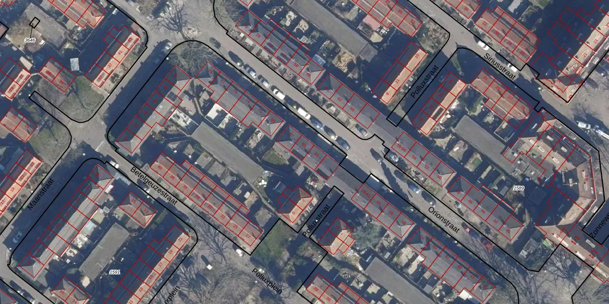 Het perceel waarop Orionstraat 65 staat heeft een oppervlakte van 1,4 ha. Dit is een zeer groot perceel. De perceeloppervlakte wordt geregistreerd door het Kadaster. Gedetailleerde informatie over de maten van dit perceel kunt u vinden in het rapport Kadastrale kaart met maatvoering van Orionstraat 65.