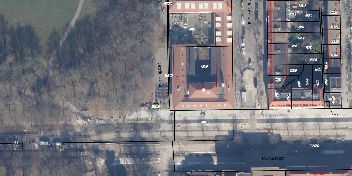 Het perceel waarop Orteliuskade 2-A staat heeft een oppervlakte van 1291 m². Dit is een zeer groot perceel. De perceeloppervlakte wordt geregistreerd door het Kadaster. Gedetailleerde informatie over de maten van dit perceel kunt u vinden in het rapport Kadastrale kaart met maatvoering van Orteliuskade 2-A.