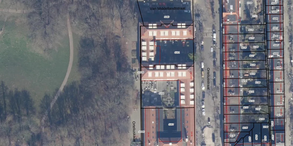 Het perceel waarop Orteliuskade 5 staat heeft een oppervlakte van 1040 m². Dit is een zeer groot perceel. De perceeloppervlakte wordt geregistreerd door het Kadaster. Gedetailleerde informatie over de maten van dit perceel kunt u vinden in het rapport Kadastrale kaart met maatvoering van Orteliuskade 5.