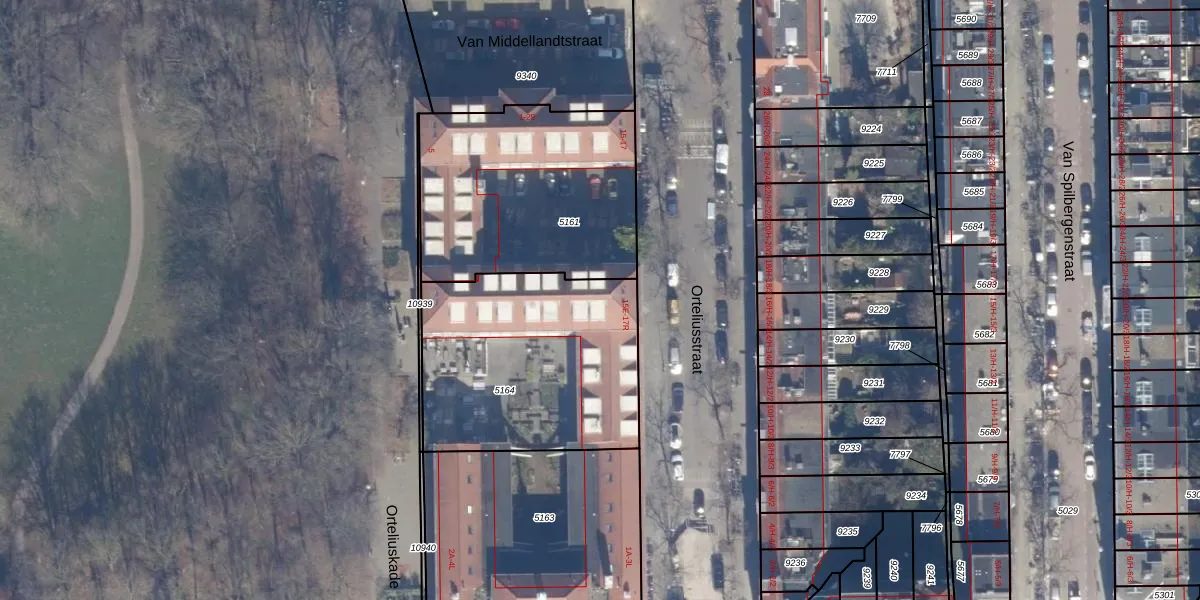 Het perceel waarop Orteliusstraat 17-B staat heeft een oppervlakte van 1040 m². Dit is een zeer groot perceel. De perceeloppervlakte wordt geregistreerd door het Kadaster. Gedetailleerde informatie over de maten van dit perceel kunt u vinden in het rapport Kadastrale kaart met maatvoering van Orteliusstraat 17-B.