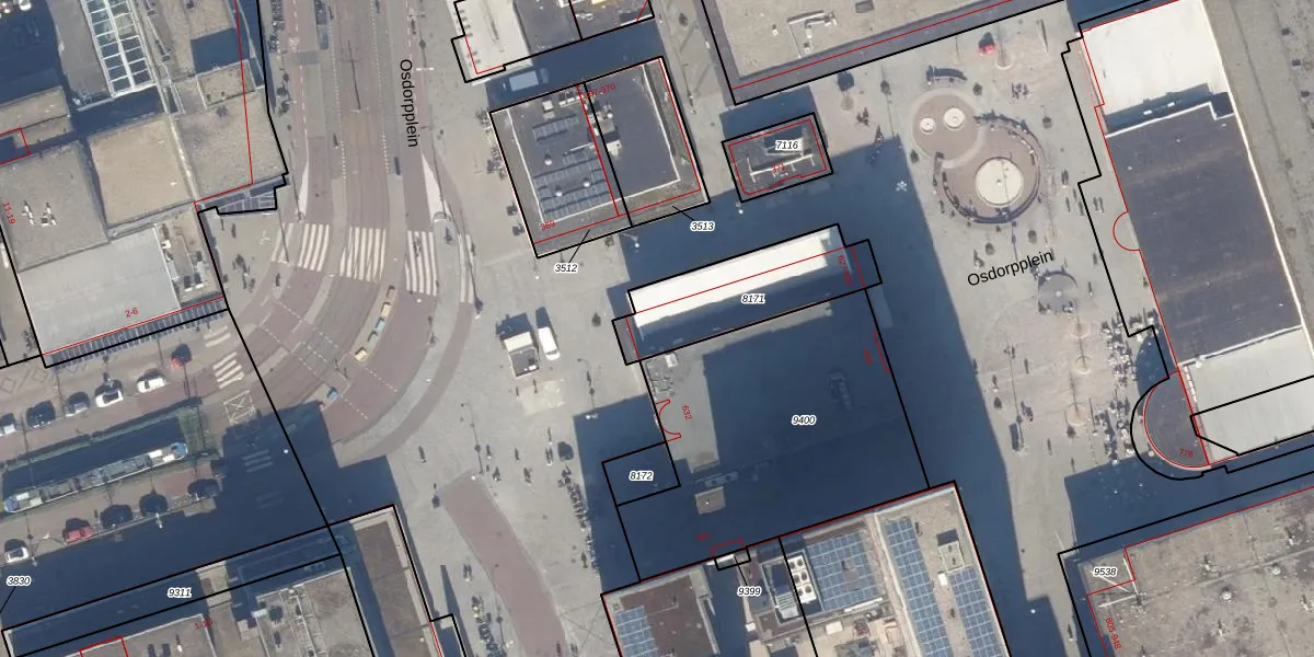 Het perceel waarop Osdorpplein 631 staat heeft een oppervlakte van 402 m². Dit is een groot perceel. De perceeloppervlakte wordt geregistreerd door het Kadaster. Gedetailleerde informatie over de maten van dit perceel kunt u vinden in het rapport Kadastrale kaart met maatvoering van Osdorpplein 631.