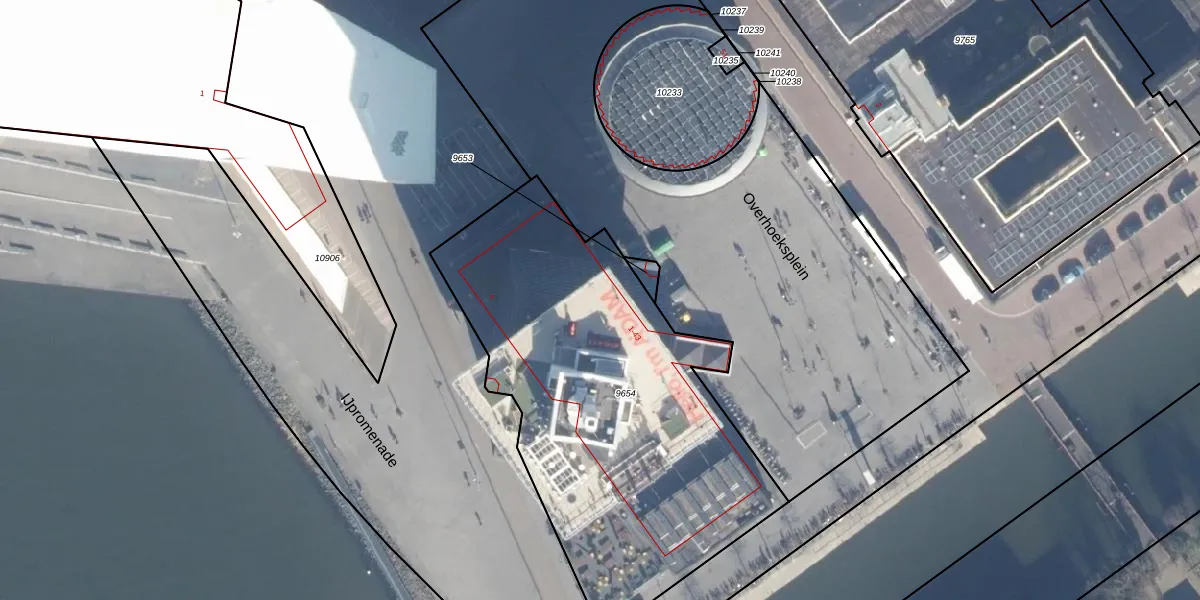 Het perceel waarop Overhoeksplein 23-K staat heeft een oppervlakte van 2150 m². Dit is een zeer groot perceel. De perceeloppervlakte wordt geregistreerd door het Kadaster. Gedetailleerde informatie over de maten van dit perceel kunt u vinden in het rapport Kadastrale kaart met maatvoering van Overhoeksplein 23-K.