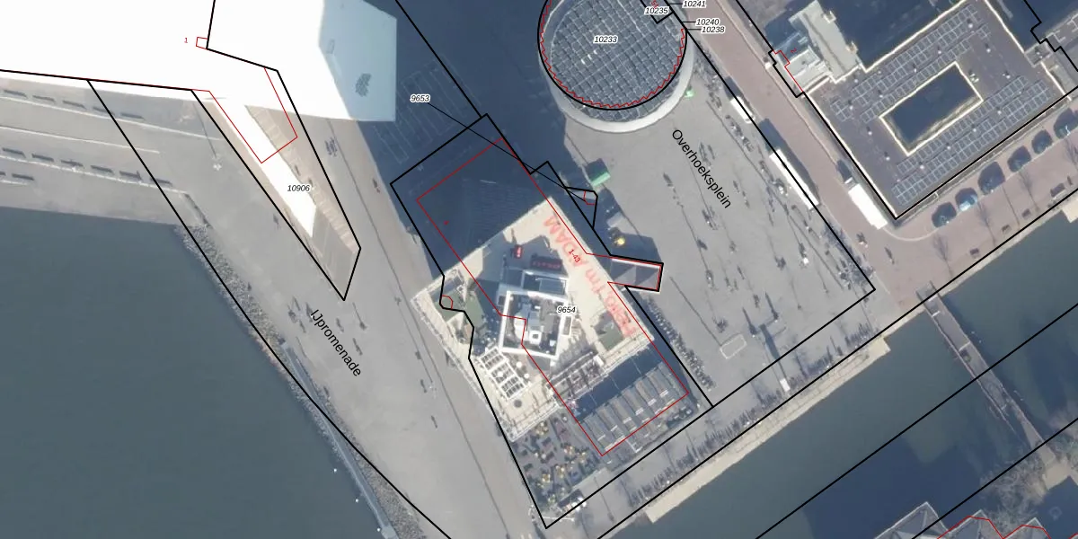 Het perceel waarop Overhoeksplein 25-A staat heeft een oppervlakte van 2150 m². Dit is een zeer groot perceel. De perceeloppervlakte wordt geregistreerd door het Kadaster. Gedetailleerde informatie over de maten van dit perceel kunt u vinden in het rapport Kadastrale kaart met maatvoering van Overhoeksplein 25-A.