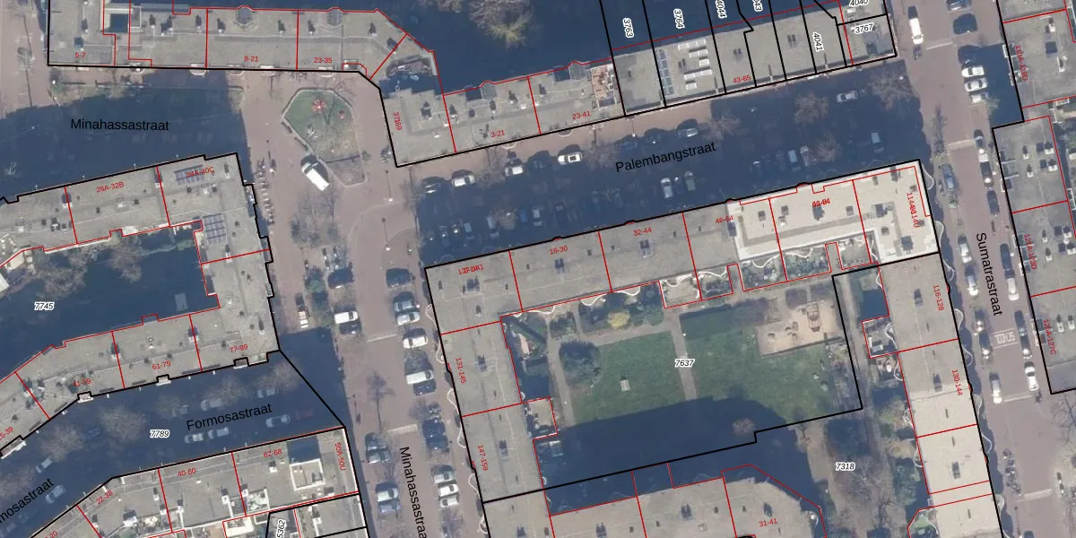 Palembangstraat 22 is gelegen op kadastraal perceel ASD19W7637. Deze kadastrale aanduiding is uniek en wordt gebruikt door het Kadaster om eigendomsrechten en andere zakelijke rechten vast te leggen. Het perceel maakt onderdeel uit van de kadastrale gemeente Amsterdam.