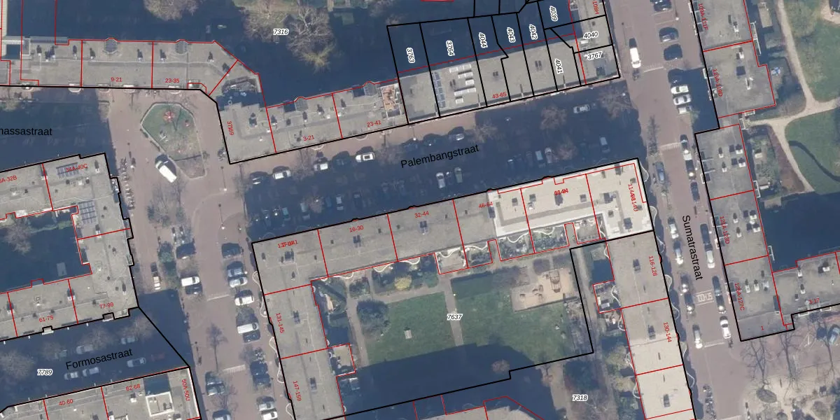 Palembangstraat 42 is gelegen op kadastraal perceel ASD19W7637. Deze kadastrale aanduiding is uniek en wordt gebruikt door het Kadaster om eigendomsrechten en andere zakelijke rechten vast te leggen. Het perceel maakt onderdeel uit van de kadastrale gemeente Amsterdam.