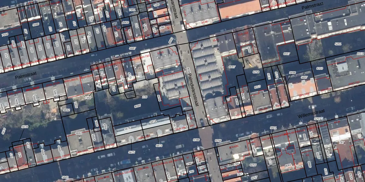 Het perceel waarop Palmdwarsstraat 30 staat heeft een oppervlakte van 557 m². Dit is een groot perceel. De perceeloppervlakte wordt geregistreerd door het Kadaster. Gedetailleerde informatie over de maten van dit perceel kunt u vinden in het rapport Kadastrale kaart met maatvoering van Palmdwarsstraat 30.
