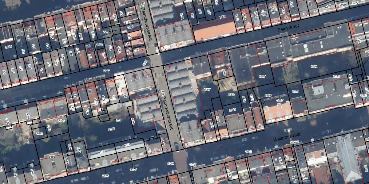 Palmdwarsstraat 53 is gelegen op kadastraal perceel ASD08L8097. Deze kadastrale aanduiding is uniek en wordt gebruikt door het Kadaster om eigendomsrechten en andere zakelijke rechten vast te leggen. Het perceel maakt onderdeel uit van de kadastrale gemeente Amsterdam.