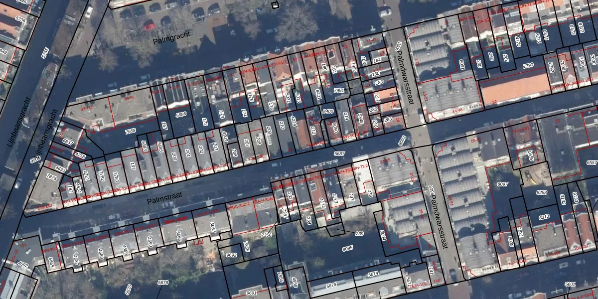 Het perceel waarop Palmstraat 64 staat heeft een oppervlakte van 88 m². Dit is een klein perceel. De perceeloppervlakte wordt geregistreerd door het Kadaster. Gedetailleerde informatie over de maten van dit perceel kunt u vinden in het rapport Kadastrale kaart met maatvoering van Palmstraat 64.