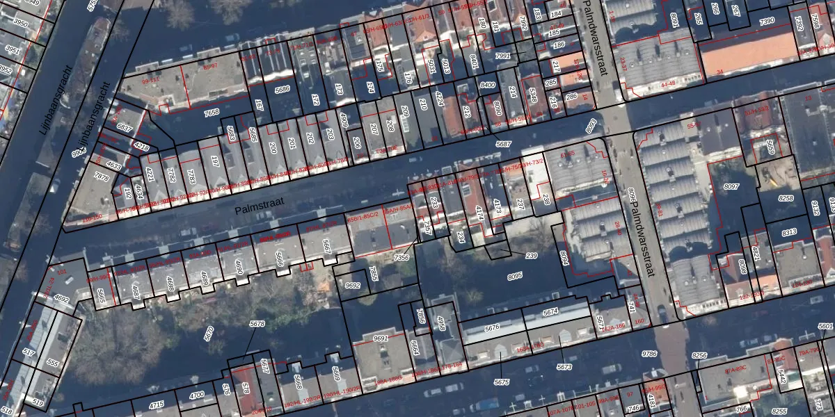 Het perceel waarop Palmstraat 83-C staat heeft een oppervlakte van 50 m². Dit is een klein perceel. De perceeloppervlakte wordt geregistreerd door het Kadaster. Gedetailleerde informatie over de maten van dit perceel kunt u vinden in het rapport Kadastrale kaart met maatvoering van Palmstraat 83-C.