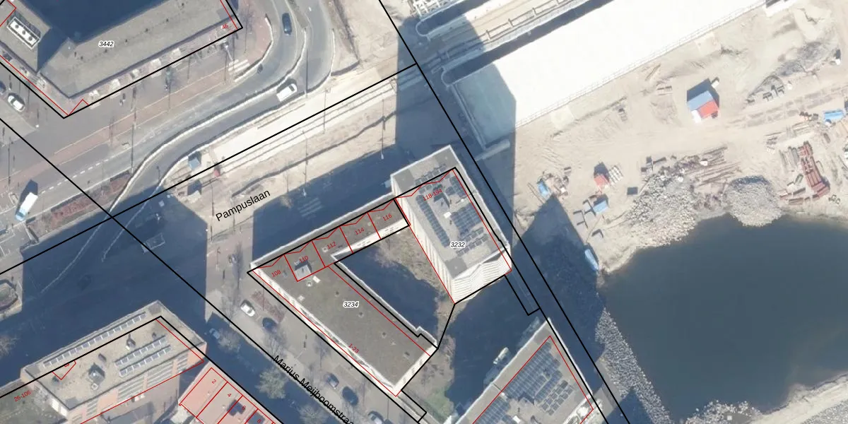 Pampuslaan 156 is gelegen op kadastraal perceel ASD41AU3232. Deze kadastrale aanduiding is uniek en wordt gebruikt door het Kadaster om eigendomsrechten en andere zakelijke rechten vast te leggen. Het perceel maakt onderdeel uit van de kadastrale gemeente Amsterdam.