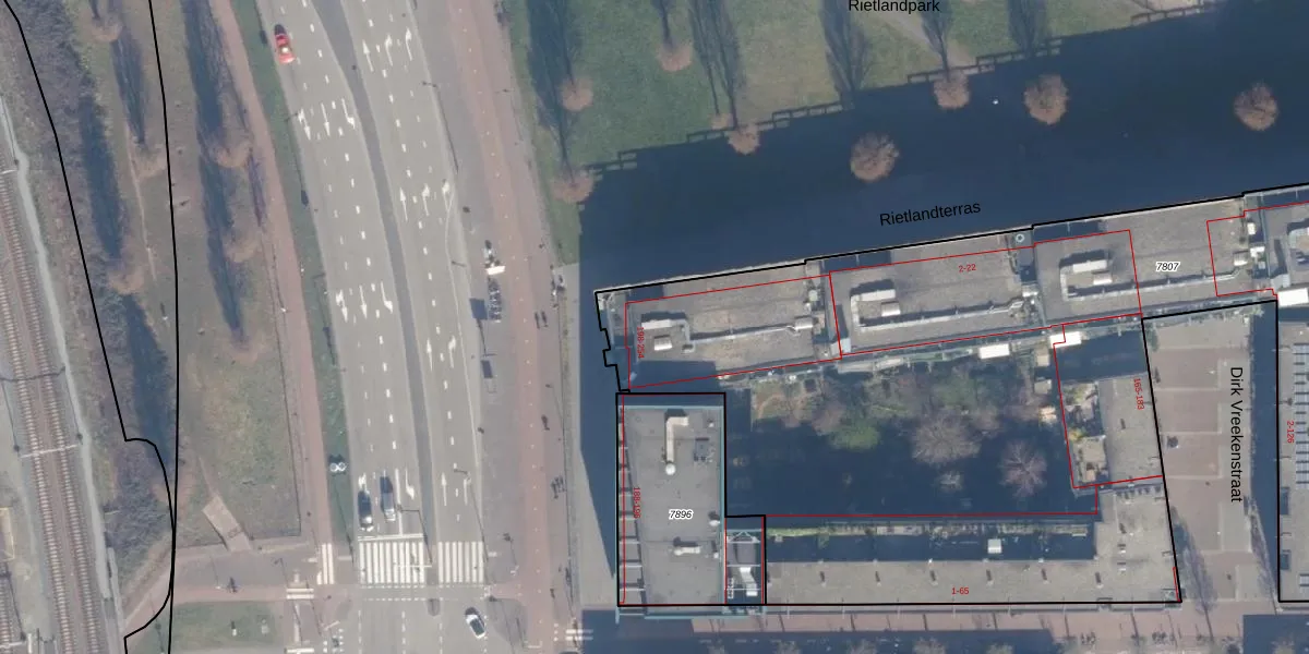 Het adres ligt op het perceel ASD02-A-7807, dat zich in de kadastrale gemeente Amsterdam bevindt. De oppervlakte van het perceel is 1,3 ha. Dat is groter dan gemiddeld in Amsterdam, waar de gemiddelde perceeloppervlakte op 2763,93 m² ligt. De grootste perceeloppervlakte in de kadastrale gemeente is 14,3 ha. De kleinste oppervlakte bedraagt 0 m². Er zijn 381 adressen aanwezig op het perceel. De huidige grenzen van het perceel zijn digitaal in de Basisregistratie Kadaster (BRK) geregistreerd op 11-01-2012.