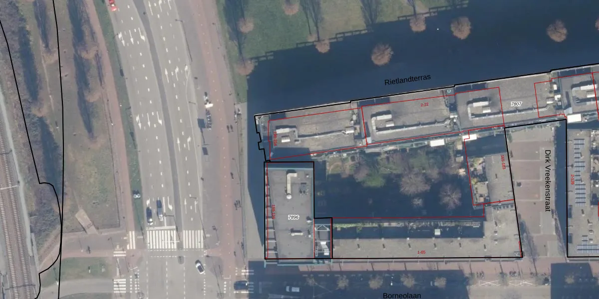 Het adres ligt op het perceel ASD02-A-7807, dat zich in de kadastrale gemeente Amsterdam bevindt. De oppervlakte van het perceel is 1,3 ha. Dat is groter dan gemiddeld in Amsterdam, waar de gemiddelde perceeloppervlakte op 2767,13 m² ligt. De grootste perceeloppervlakte in de kadastrale gemeente is 14,3 ha. De kleinste oppervlakte bedraagt 0 m². Op het perceel liggen in totaal 381 adressen. De huidige grenzen van het perceel zijn digitaal in de Basisregistratie Kadaster (BRK) geregistreerd op 11-01-2012.
