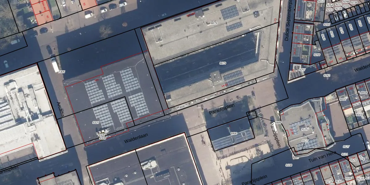 Het perceel waarop Paradijsplein 43 staat heeft een oppervlakte van 1627 m². Dit is een zeer groot perceel. De perceeloppervlakte wordt geregistreerd door het Kadaster. Gedetailleerde informatie over de maten van dit perceel kunt u vinden in het rapport Kadastrale kaart met maatvoering van Paradijsplein 43.