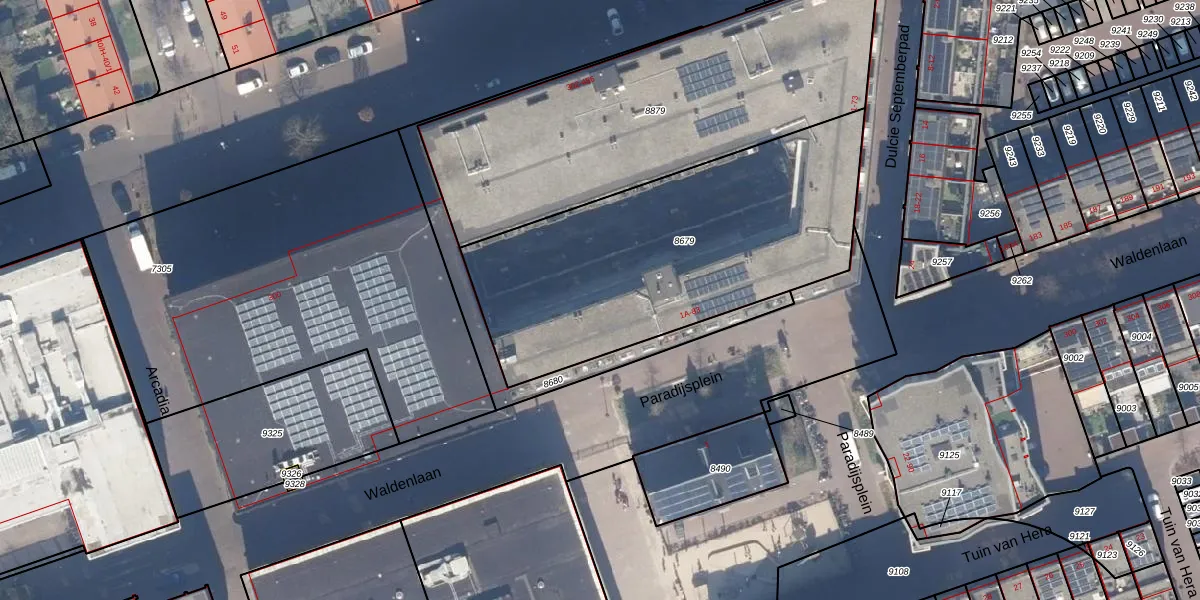 Het perceel waarop Paradijsplein 7 staat heeft een oppervlakte van 1627 m². Dit is een zeer groot perceel. De perceeloppervlakte wordt geregistreerd door het Kadaster. Gedetailleerde informatie over de maten van dit perceel kunt u vinden in het rapport Kadastrale kaart met maatvoering van Paradijsplein 7.