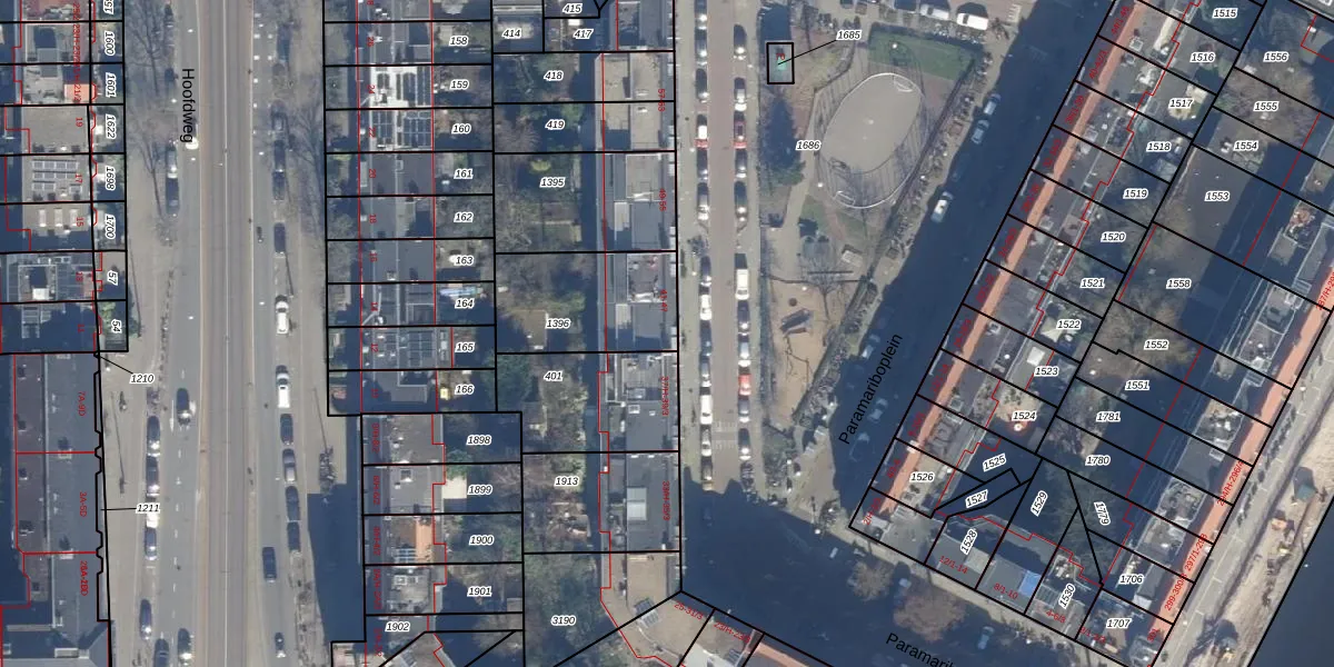 Het perceel waarop Paramariboplein 41 staat heeft een oppervlakte van 414 m². Dit is een groot perceel. De perceeloppervlakte wordt geregistreerd door het Kadaster. Gedetailleerde informatie over de maten van dit perceel kunt u vinden in het rapport Kadastrale kaart met maatvoering van Paramariboplein 41.