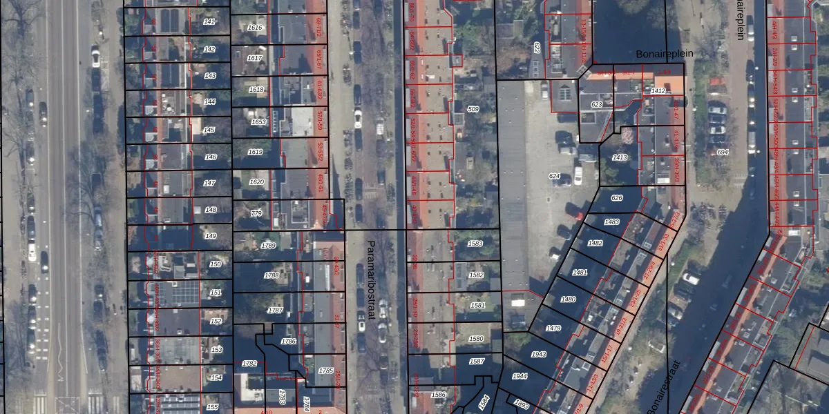 Het perceel waarop Paramaribostraat 42-2 staat heeft een oppervlakte van 1489 m². Dit is een zeer groot perceel. De perceeloppervlakte wordt geregistreerd door het Kadaster. Gedetailleerde informatie over de maten van dit perceel kunt u vinden in het rapport Kadastrale kaart met maatvoering van Paramaribostraat 42-2.