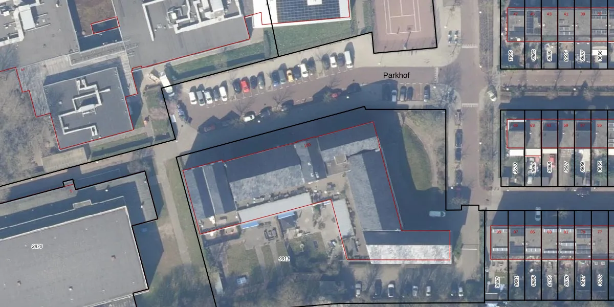 Het perceel waarop Parkhof 100 staat heeft een oppervlakte van 5250 m². Dit is een zeer groot perceel. De perceeloppervlakte wordt geregistreerd door het Kadaster. Gedetailleerde informatie over de maten van dit perceel kunt u vinden in het rapport Kadastrale kaart met maatvoering van Parkhof 100.