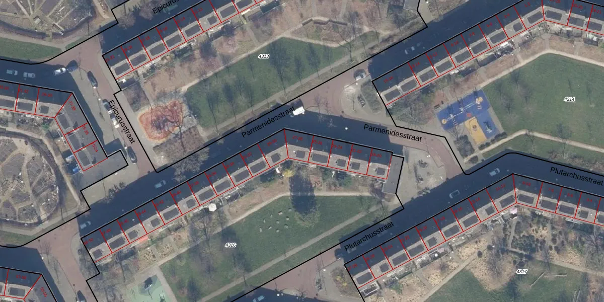 Het perceel waarop Parmenidesstraat 27 staat heeft een oppervlakte van 4167 m². Dit is een zeer groot perceel. De perceeloppervlakte wordt geregistreerd door het Kadaster. Gedetailleerde informatie over de maten van dit perceel kunt u vinden in het rapport Kadastrale kaart met maatvoering van Parmenidesstraat 27.