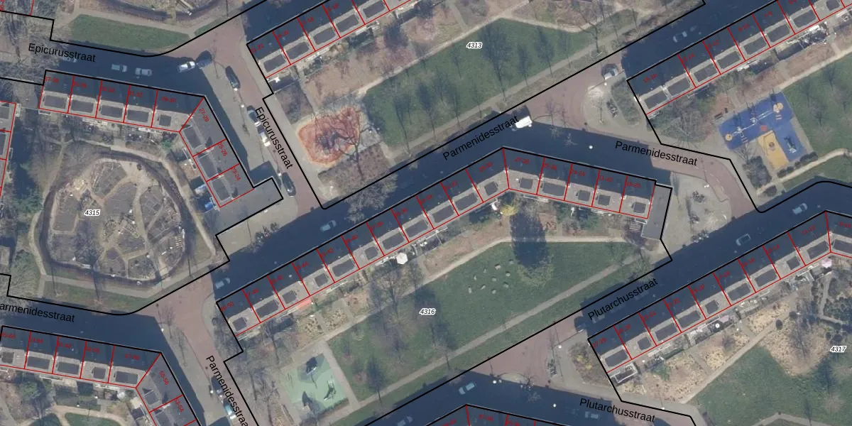 Het perceel waarop Parmenidesstraat 34 staat heeft een oppervlakte van 4167 m². Dit is een zeer groot perceel. De perceeloppervlakte wordt geregistreerd door het Kadaster. Gedetailleerde informatie over de maten van dit perceel kunt u vinden in het rapport Kadastrale kaart met maatvoering van Parmenidesstraat 34.