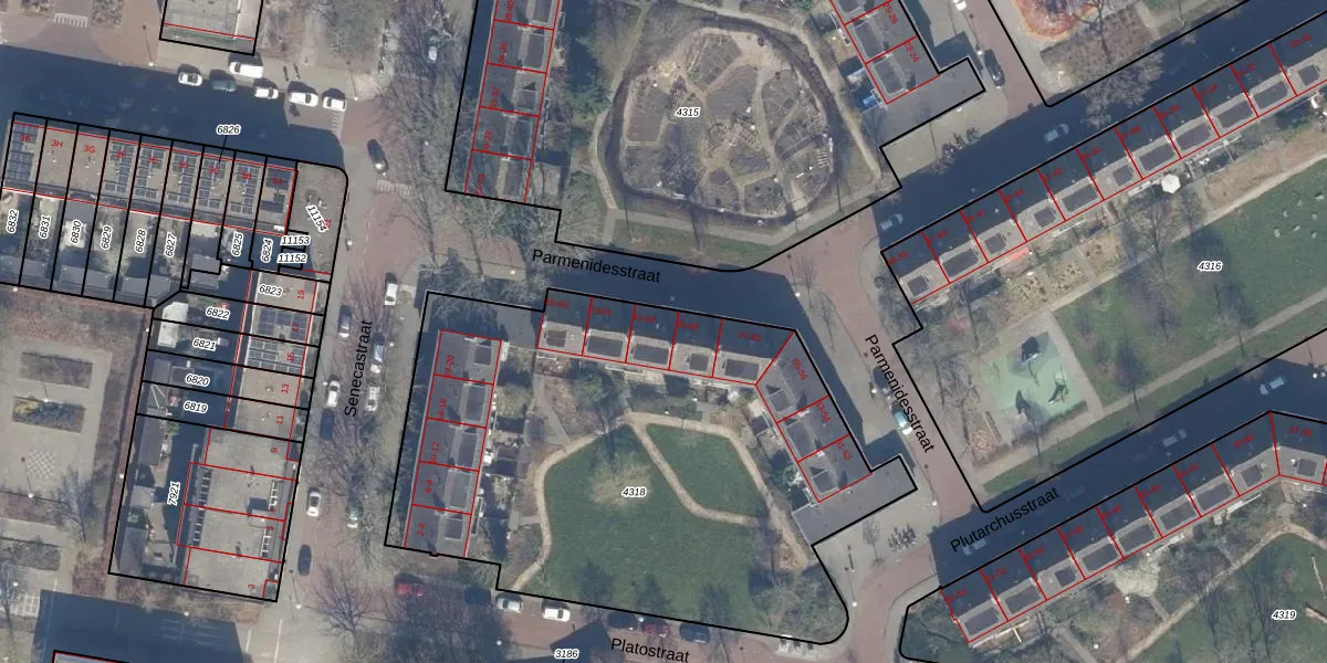 Het perceel waarop Parmenidesstraat 61 staat heeft een oppervlakte van 2974 m². Dit is een zeer groot perceel. De perceeloppervlakte wordt geregistreerd door het Kadaster. Gedetailleerde informatie over de maten van dit perceel kunt u vinden in het rapport Kadastrale kaart met maatvoering van Parmenidesstraat 61.