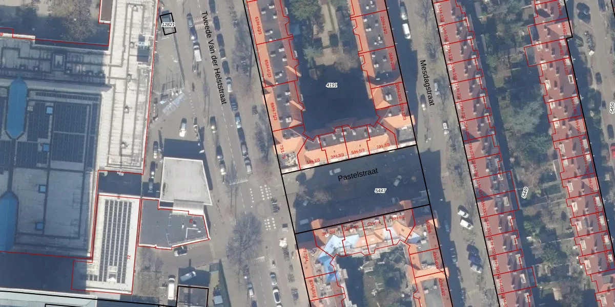 Pastelstraat 1-3 is gelegen op kadastraal perceel ASD18V4191. Deze kadastrale aanduiding is uniek en wordt gebruikt door het Kadaster om eigendomsrechten en andere zakelijke rechten vast te leggen. Het perceel maakt onderdeel uit van de kadastrale gemeente Amsterdam.